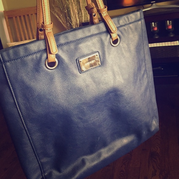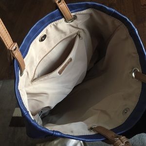 Royal blue tote with neutral brown handles. Works well as a laptop carrying bag or perfect for work and travel