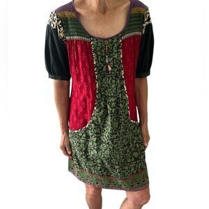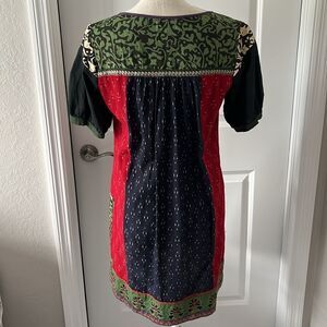 Embrace a vibrant look with this multicolor bohemian dress. Featuring a mix of red, green, and black, this dress is perfect for any casual outing.