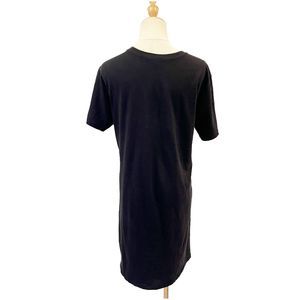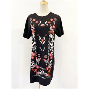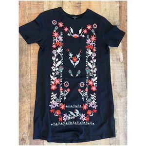 Chic black mini dress. Features vibrant floral embroidery. Perfect for any occasion.