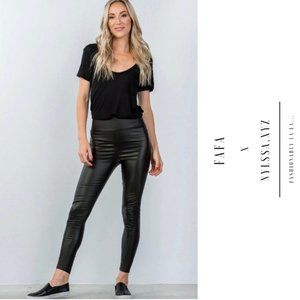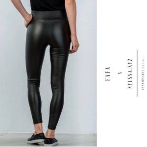 Black matte coated legging. High rise. Wide-cut, stretch waistband. Bodycon fit. A tight cut to the body.