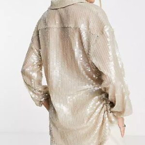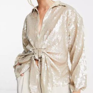 Sequin fabric with tie front detail, collar, long sleeves and elasticated cuff.