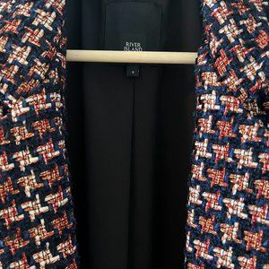 Boucle woven coat from River Island. Used ONCE. Impeccable condition. This works as a warm coat for layering or as a blazer. Red and navy tones with a beautiful and subtle gold threading. See pictures for exact coloring. Tailored side pockets and lapel. Quality interior lining.