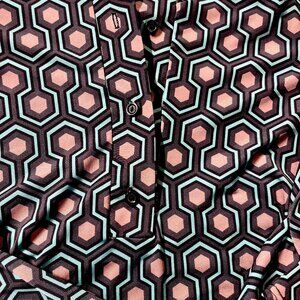 In excellent pre-owned condition. This shirt is giving off a retro flare with that geometric print, collar and tie front. Could be styled in so many ways! Pending on your size, this could be a super-mini dress since it’s in a longer style. UK size 8/ US size 4. Measurements enclosed as I would consider this garment a small (in my opinion). Polyester/ elastane blend. This shirt has some stretch to it.