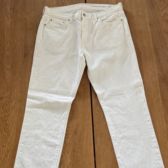 Elegant cream slim jeans by River Island. Perfect for a sleek look. Two stains: 1 Freckle size stain on back by waist and 1 two-finger sized stain on the back left leg. Organic Cotton. Smoke free and Pet free home.