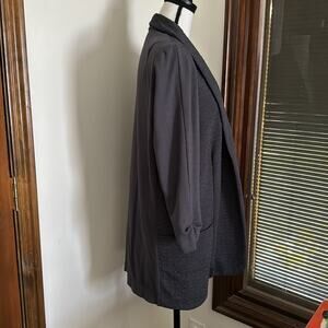 Dark gray open front sweater/cardigan. Patterned texture on the front. Has pockets. Solid cloth on the back. In great used condition, no flaws or damage to note.