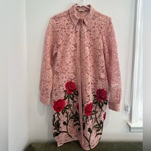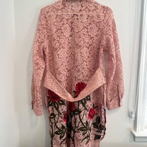 Elegant pink lace dress or top Features stunning red rose embroidery. Perfect for special occasions.