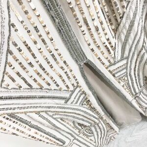 This is a beautiful dress and has a tan color on the bottom with beautiful sequin details