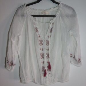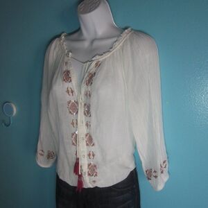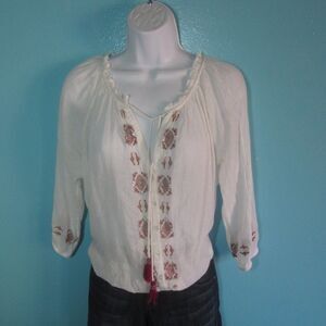 Womens gauzy cotton blouse with red tassled ties as well as embroidery & embellishments on front.