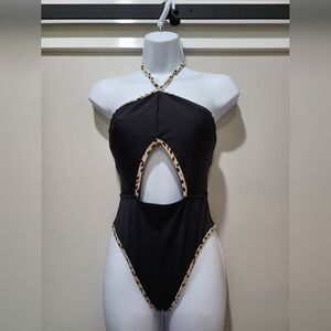 River Island textured halter neck swimsuit in black and leopard NWT size 4