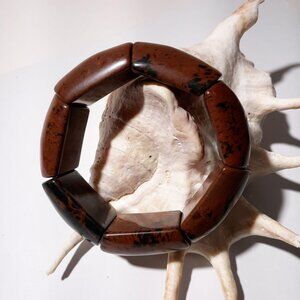 Handcrafted River Jasper bracelet featuring natural stone beads in earthy brown and black tones. This stretch bangle is perfect for adding a touch of rustic elegance to any outfit.