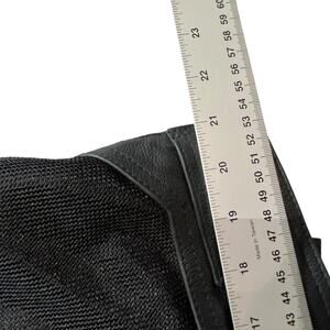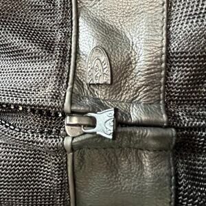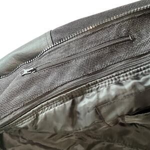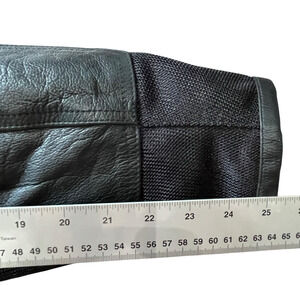 The River Road Motorcycle Jacket in Men's size 44 is a black leather and mesh jacket with a zip out liner, making it versatile for all seasons. It features a zipper closure, chest size of 46 inches, and five pockets for convenient storage. Designed for breathability and comfort, this jacket is perfect for motorcyclists looking for style and functionality on the road. Made in the United States, this jacket combines quality craftsmanship with essential features for any rider.