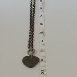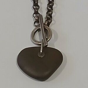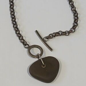 A Beautifully Handcrafted piece by Terri Logan. Natural River Rock has its own unique features. Looks granite in color but, under light it can sometimes have slight hue of sage with some various natural markings. Silver round link chain measures 9" in Length to the bottom of the stone. The necklace wraps around the back of the neck and has a silver toggle closure. You will be able to tell which side is placed towards the chest. One side of the river rock is almost flat to the touch.