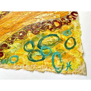 There is a combination of colors soaked into the paper as well as thick wax paint sitting on top, inviting the viewer to take their time enjoying all the layers this special artwork has to offer.