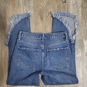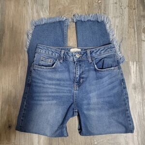 River island jeans with frayed asymmetrical hem see pics size 6 per tags used no holes or stains measurements approximately flat lay waist 13 front rise 9 inseam 23