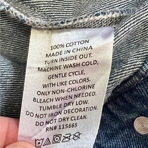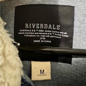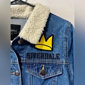 Riverdale branded trucker style denim jean jacket with a sherpa lined collar (jacket itself is NOT sherpa lined), embroidered "Riverdale" on front chest with crown patch, graffiti style "Jughead Jones Wuz Here" printed on back of jacket, 100% cotton fabrication, full button front closure, side slit pockets, button chest pockets.