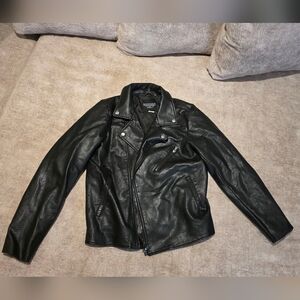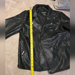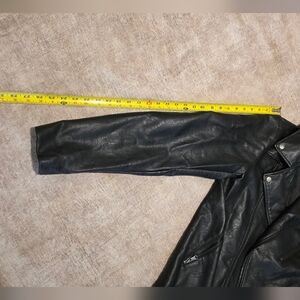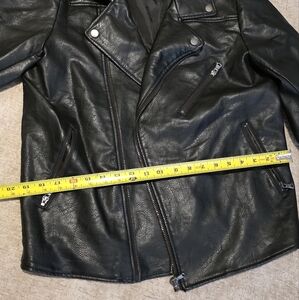 Fabric: 100% PU (faux leather). Lining: polyester, Notched lapel collar with snaps, Full zip front, Faux chest pocket, Zippered front pockets. all zippers work. size medium, measurements are approximate. see all pictures, has hole in left under arm