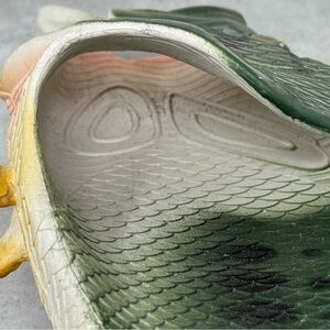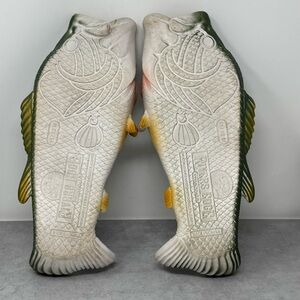 Step into a world of whimsy with these unique bass-shaped sandals, featuring a vibrant green and pink color scheme. The detailed scaled texture and fish head design at the toe area add a playful touch to your footwear collection. Perfect for those who love to make a statement with their style.