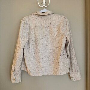 Rivet & Thread half button-up top in cozy flannel material in size medium. The color is a heathered beige/tan/oatmeal. Features two pockets on the front, functional buttons that run about half way down the top, and a collar.