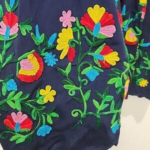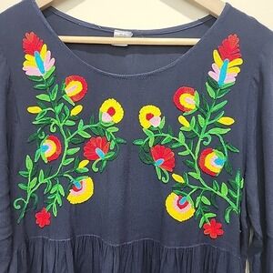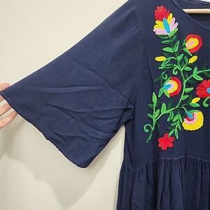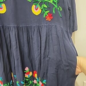 Riviera Sun Boho Embroidered Peasant Dress Navy Large Flowy w/ Pockets