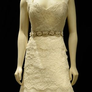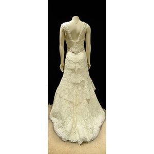 Trumpet Silhouette, modified to a sweetheart neck line with off-shoulder cap sleeves, natural waistline, floor length, non-used veil available.