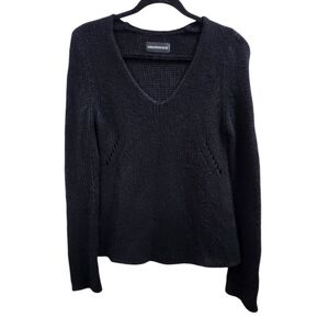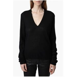 Wrap yourself in the cozy elegance of the Rivy V-Neck Sweater by Zadig & Voltaire. A must-have addition to your wardrobe, this piece embodies casual sophistication with its chic black hue and versatile pullover style. Designed for the modern woman, the size M sweater fits comfortably within the regular size range, ensuring a flattering fit for a variety of body types. The sweater's distinctive V-neckline adds a touch of allure to the simple yet stylish design, making it an ideal choice for both laid-back and more polished occasions. Crafted with the care and quality expected from the renowned brand Zadig & Voltaire, this sweater is a timeless piece that blends effortlessly with your existing collection.