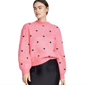 This is a balloon sleeve pullover sweater by Rixo London. Made from a pink mid-weight brushed knit with allover black embroidered hearts.