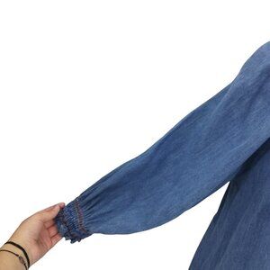 Design: Denim mini dress with smocked neck and puff sleeve cuffs with ruffle hem