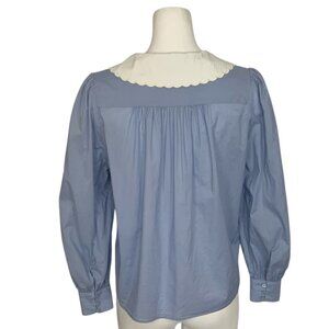 This Rixo women's Lila Blouse Top makes a statement due to it's balloon long sleeve, button cuffs, puff shoulder, white wide pilgrim collar with floral embroidery, scalloped trim, button front, slight high low hem, relaxed fit and blue shade.
