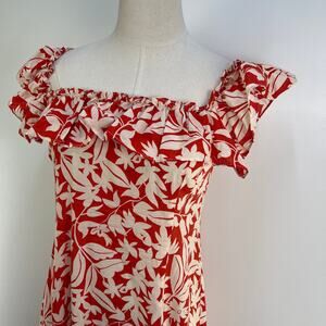 Preowned item in excellent overall condition. No odors, stains, or holes. The June midi dress from RIXO in tomato palm cotton lives up to its title not only for it’s all-over graphic print, reminiscent of vines, climbers and growth, but for it’s background red colour, ripe and succulent enough to embody the namesake entirely. Wear to a summer night date or brunch.