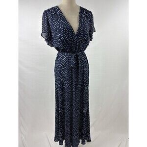 RIXO Evie Maxi Dress | Navy Blue with White Polka Dots | UK Size 10 | Luxury Designer | V-neck Short Sleeve | Partially Lined