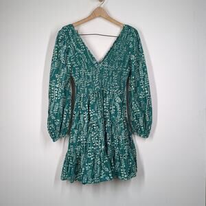 long sleeve eyelet lace floral mini dress tiered v-neck v-back double v neckline floral print flower print teal green puff sleeves boho bohemian cottagecore