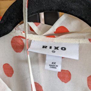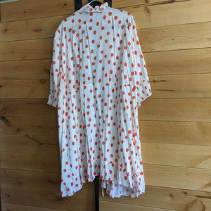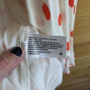Wonderful true wrap dress with red/orange polka dots. Puff sleeves, lined skirt, and ruffle detail. Difficult to measure due to style. Approximate measurements laying flat, pit to pit 26", 41" shoulder to hem. pet and smoke free home.