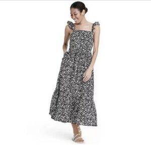 White daisies bloom amidst this black midi dress for a blush of lovely flair, sweetened up even more by ruffles on the straps and a flouncy tiered hem.