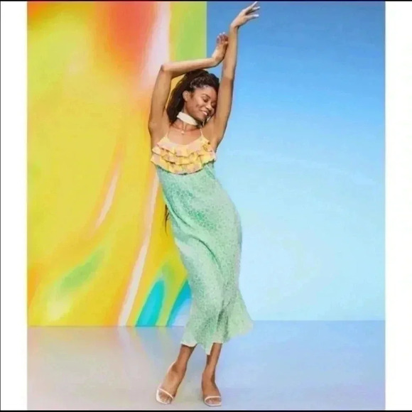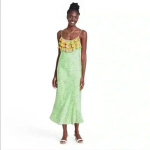 Rixo x Target Green Yellow Ruffle Animal Print Slip Midi Dress Boho NWT