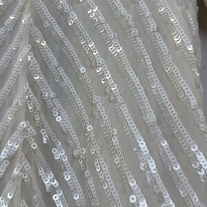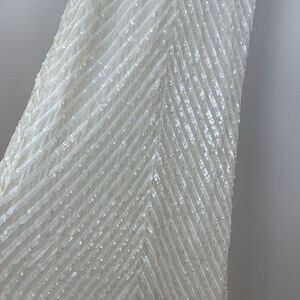 White sequins (100% Polyester). Hourglass. Short sleeves. V-neck. Side zipper closure. 53" from shoulder to hemline.