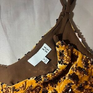 Shine in this stunning sequin leopard print cami top. Perfect for a night out, this top features a bold brown and gold design. Pair it with your favorite jeans or skirt for a chic look.