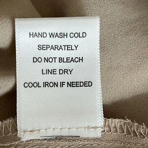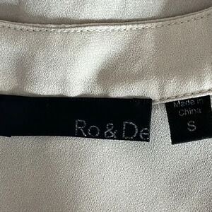 Ro & De Surplice Long Sleeve Hi Lo Hem Blouse in Tan - Size Small. Excellent pre-owned condtion. Is new without tags but had some pallet dirt on it so I washed it and hung it to dry. Surplice bodice with modesty snap, long sleeves with button cuffs, hi lo hemline. Approximate measurements: 20" pit to pit, 24" front length, 28" back length.