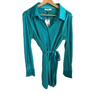 Ro & De Teal Collared Button-Up Pleated Mini Shirt Dress Women's Size L