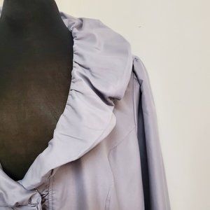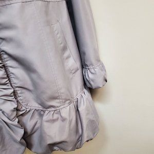 Roaman's / 3/4 length / light weight / jacket / ruffle collar and cuffs / snap closure / 100% polyester / pre-owned / gently worn / cleaned and sanitized / smoke free home / see photos for signs of wear