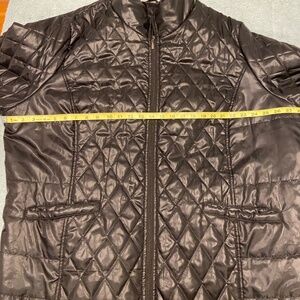 Stay cozy and stylish in this classic black quilted puffer coat from Roaman’s, size 2X. Made of 100% polyester, it features a full zip front closure, a wearable collar that can be worn up or folded down, and two open front pockets. The front showcases a mixed quilting design with diamond and horizontal stitching for added texture, while the back remains sleek with two vertical seams and no quilting. With a pit-to-pit measurement of 29" and a length of 37", this jacket offers warmth with a flattering silhouette.