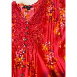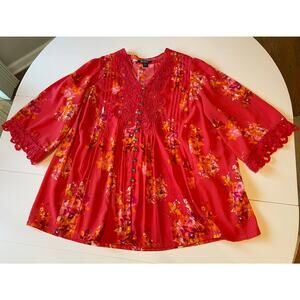 Roaman’s Blouse Top Pintucks Crochet Lace Button Detail Sz 14W Bell Sleeves Red