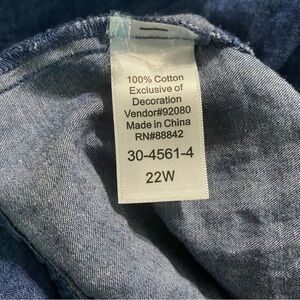 Roamans Womens Plus 22W Blue Denim Look Cotton Floral Cut Out V Neck Button Up in excellent used condition. The shirt is a 3/4 tab sleeve. No stains, tears or rips.