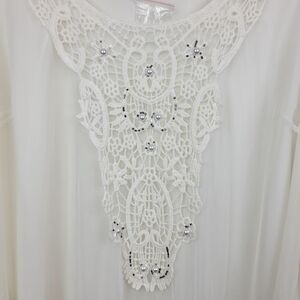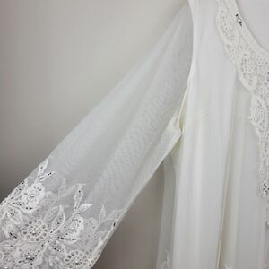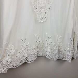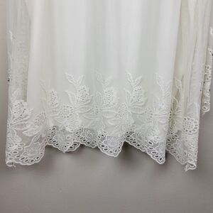 Roaman's. Size 22W. Ivory, Off-White. Lace Detail. Pearl/Bead Embellishments. Sheer Mesh Overlay. Long, Sheer Mesh Sleeves. Scalloped Cuffs. Scoop Neckline. Scalloped Hem. Partially Lined. Pullover Style. Tunic Length. Nylon.