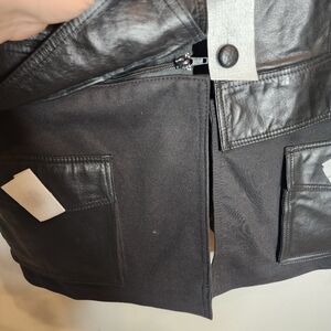 roamans black genuine leather button front jacket with optional zip off bottom hem. the bottom piece is a ponte fabric with pockets.