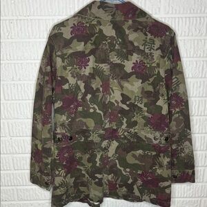 Chic utility jacket with a camouflage and floral design. Features buttoned pockets and a relaxed fit. Perfect for layering.