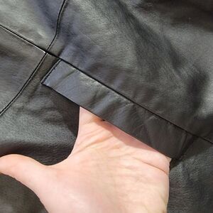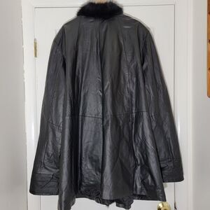 Roaman's Plus Size 32W Black Genuine Leather Coat with Faux Fur Trim and metal hooks front closure. Excellent used condition. Mob Wife aesthetic. Fully lined.