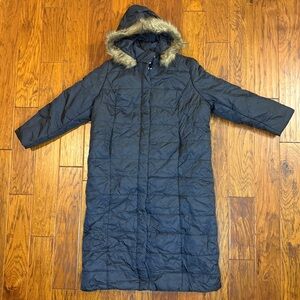 Stylish long black puffer coat featuring a cozy fur hood. Perfect for cold weather.