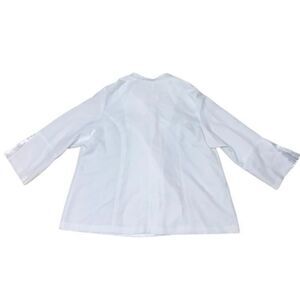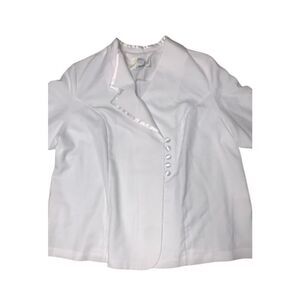 White two-piece skirt set. Button front. 3/4 bell sleeve. Midi skirt with elasticized waist. 100% polyester. Size: 30W. Preowned in good condition.