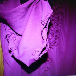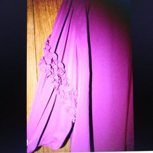 Women's Roamans Plus size 22 magenta blouse. Front has ruffles down the front and at shoulders. Buttons down the front. 3/4 sleeves. Silky polyester blend. Good used condition, no stains or rips. Approximate Measurements: