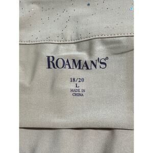 Roamans Top Womens Large 18 20 Tan Beige Tunic Cold Shoulder 3/4 Sleeves Sparkle Rhinestone Embellished Wide Shoulder Straps Party NYE Glam Holiday Asymmetrical Hanky Hem Pullover Shimmer Stretch Comfortable Travel Special Occasion